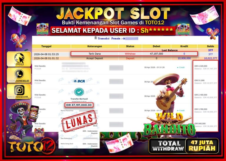 Selamat kepada Member Kami Sh***** Telah Jackpot dan berhasil mendapatkan kemenangan besar pada permainan JACKPOT SLOT GAME (WILD BANDITO) Dengan Kemenangan Sebesar Rp.47.197.000–. Setelah mengisi Fomulir Withdraw dengan Kurang waktu 1-2 Menit Dana sudah kami Trasnfer kepada Pemilik Userid dan dana sudah dapat di cairkan oleh pemenang. Bukti Pembayaran yang TOTO12 berikan merupakan Bukti Pembayaran yang SAH…