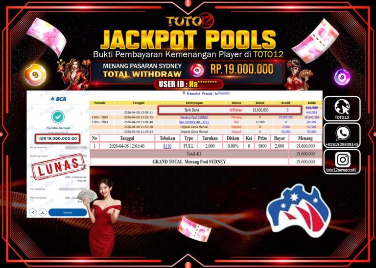 Selamat kepada Member Kami Ha****** Telah Jackpot dan berhasil mendapatkan kemenangan besar pada permainan JACKPOT POOLS PASARAN ( SYDNEY ) Dengan Kemenangan Sebesar Rp.19.000.000–. Setelah mengisi Fomulir Withdraw dengan Kurang waktu 1-2 Menit Dana sudah kami Trasnfer kepada Pemilik Userid dan dana sudah dapat di cairkan oleh pemenang. Bukti Pembayaran yang TOTO12 berikan merupakan Bukti Pembayaran…