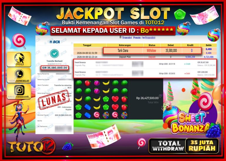 Selamat kepada Member Kami Bo***** Telah Jackpot dan berhasil mendapatkan kemenangan besar pada permainan JACKPOT SLOT GAME (SWEET BONANZA) Dengan Kemenangan Sebesar Rp.35.580.000–. Setelah mengisi Fomulir Withdraw dengan Kurang waktu 1-2 Menit Dana sudah kami Trasnfer kepada Pemilik Userid dan dana sudah dapat di cairkan oleh pemenang. Bukti Pembayaran yang TOTO12 berikan merupakan Bukti Pembayaran yang SAH…