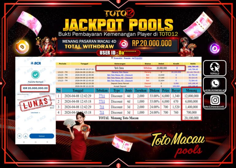 Selamat kepada Member Kami Da****** Telah Jackpot dan berhasil mendapatkan kemenangan besar pada permainan JACKPOT POOLS PASARAN (MACAU 4D) Dengan Kemenangan Sebesar Rp.20.000.000–. Setelah mengisi Fomulir Withdraw dengan Kurang waktu 1-2 Menit Dana sudah kami Trasnfer kepada Pemilik Userid dan dana sudah dapat di cairkan oleh pemenang. Bukti Pembayaran yang TOTO12 berikan merupakan Bukti Pembayaran yang SAH…