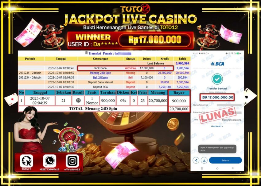 Selamat kepada Member Kami Da****** Telah Jackpot dan berhasil mendapatkan kemenangan besar pada permainan JACKPOT LIVE CASINO (24D SPIN) Dengan Kemenangan Sebesar Rp.17.000.000 –. Setelah mengisi Fomulir Withdraw dengan Kurang waktu 1-2 Menit Dana sudah kami Trasnfer kepada Pemilik Userid dan dana sudah dapat di cairkan oleh pemenang. Bukti Pembayaran yang TOTO12 berikan merupakan Bukti Pembayaran yang SAH / VALID yang langsung Di dapatkan melalui transaksi dari Bank yang di Tunju.