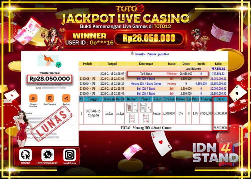 HANYA DI TOTO12 JP PASTI DI BAYAR LUNAS DAN CEPAT!!!!!! JACKPOT LIVE CASINO (IDN 4 STAND) Rp.28.050.000 !!!!