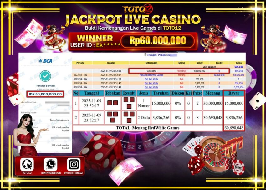 Selamat kepada Member Kami Ek****** Telah Jackpot dan berhasil mendapatkan kemenangan besar pada permainan JACKPOT LIVE CASINO (REDWHITE GAMES) Dengan Kemenangan Sebesar Rp.60.000.000 –. Setelah mengisi Fomulir Withdraw dengan Kurang waktu 1-2 Menit Dana sudah kami Trasnfer kepada Pemilik Userid dan dana sudah dapat di cairkan oleh pemenang. Bukti Pembayaran yang TOTO12 berikan merupakan Bukti Pembayaran yang SAH / VALID yang langsung Di dapatkan melalui transaksi dari Bank yang di Tunju.