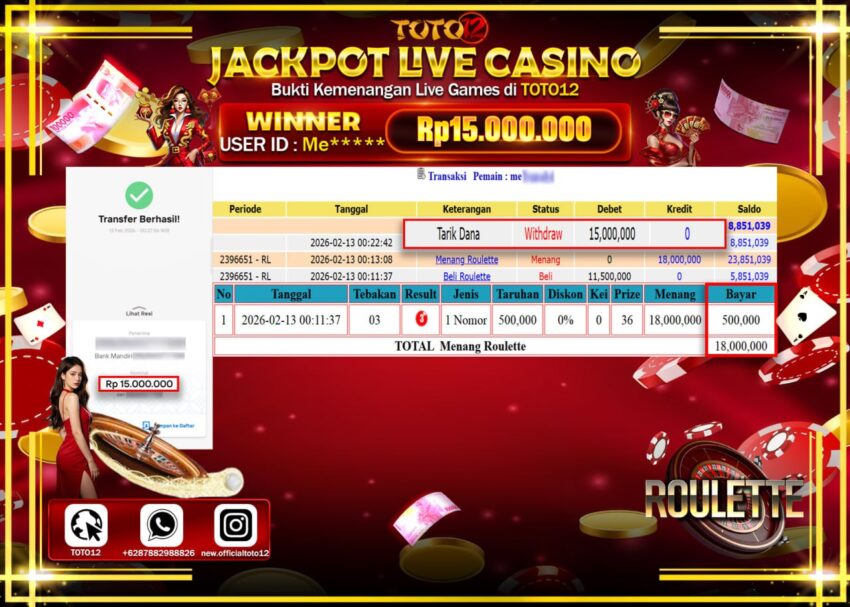 Selamat kepada Member Kami Me***** Telah Jackpot dan berhasil mendapatkan kemenangan besar pada permainan JACKPOT LIVE CASINO (ROULETTE)  Dengan Kemenangan Sebesar Rp.15.000.000–.  Setelah mengisi Fomulir Withdraw dengan Kurang waktu 1-2 Menit Dana sudah kami Trasnfer kepada Pemilik Userid dan dana sudah dapat di cairkan oleh pemenang. Bukti Pembayaran yang TOTO12 berikan merupakan Bukti Pembayaran yang  SAH / VALID yang langsung Di dapatkan melalui transaksi dari Bank yang di Tunju.