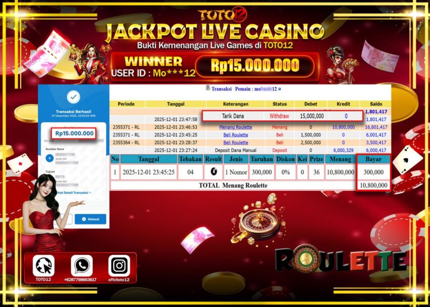 Selamat kepada Member Kami Mo****** Telah Jackpot dan berhasil mendapatkan kemenangan besar pada permainan JACKPOT LIVE CASINO (ROULETTE) Dengan Kemenangan Sebesar Rp.15.000.000 –.