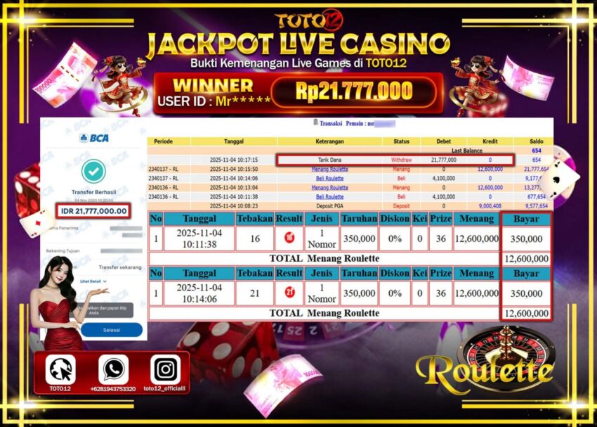 Selamat kepada Member Kami Mr****** Telah Jackpot dan berhasil mendapatkan kemenangan besar pada permainan JACKPOT LIVE CASINO (ROULETTE) Dengan Kemenangan Sebesar Rp.21.777.000 –. Setelah mengisi Fomulir Withdraw dengan Kurang waktu 1-2 Menit Dana sudah kami Trasnfer kepada Pemilik Userid dan dana sudah dapat di cairkan oleh pemenang. Bukti Pembayaran yang TOTO12 berikan merupakan Bukti Pembayaran yang SAH / VALID yang langsung Di dapatkan melalui transaksi dari Bank yang di Tunju.
