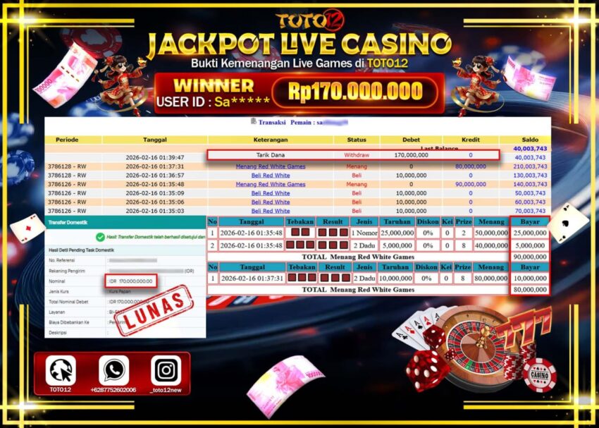 HANYA DI TOTO12 JP PASTI DI BAYAR LUNAS DAN CEPAT!!!!!! JACKPOT LIVE GAME CASINO (RED WHITE) Rp.170.000.000!!!!
