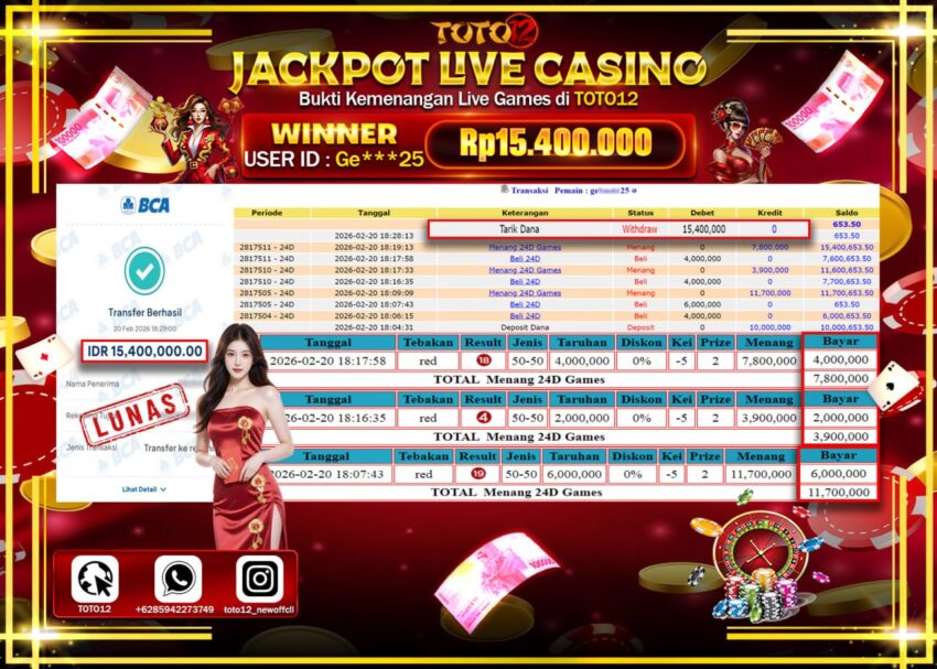 Selamat kepada Member Kami Ge******25 Telah Jackpot dan berhasil mendapatkan kemenangan besar pada permainan JACKPOT LIVE GAMES CASINO (24D) Dengan Kemenangan Sebesar Rp.15.400.000–.