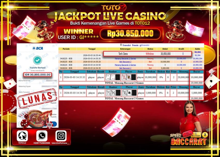 Selamat kepada Member Kami GI****** Telah Jackpot dan berhasil mendapatkan kemenangan besar pada permainan JACKPOT LIVE GAMES CASINO (BACCARAT 2) Dengan Kemenangan Sebesar Rp.30.850.000–.