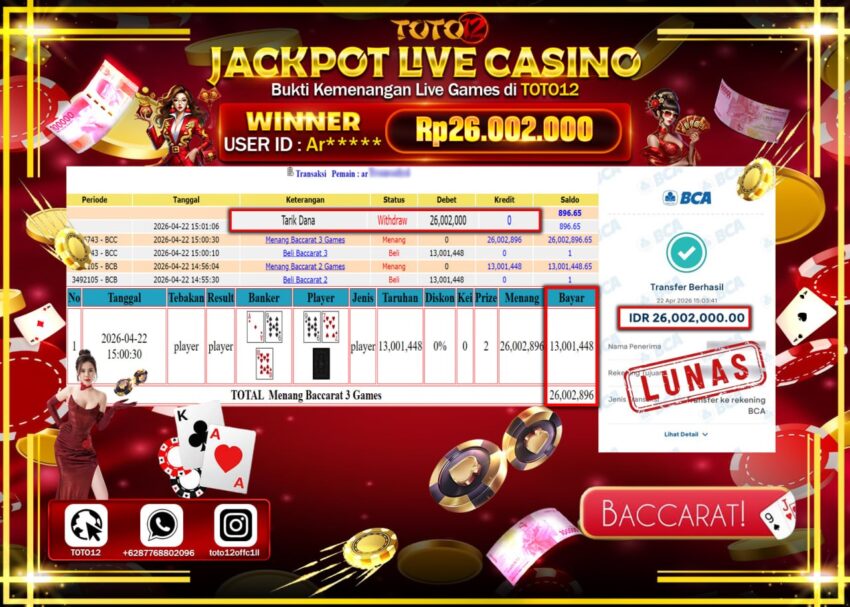 Selamat kepada Member Kami Ar***** Telah Jackpot dan berhasil mendapatkan kemenangan besar pada permainan JACKPOT LIVE GAMES CASINO (BACCARAT 3) Dengan Kemenangan Sebesar Rp.26.002.000–.