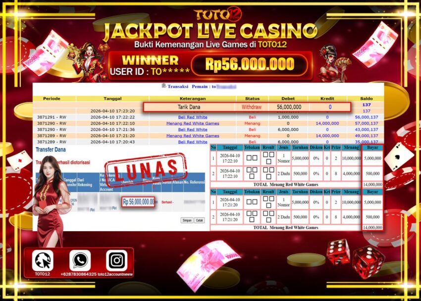 Selamat kepada Member Kami TO**** Telah Jackpot dan berhasil mendapatkan kemenangan besar pada permainan JACKPOT LIVE GAMES CASINO ( RED WHITE ) Dengan Kemenangan Sebesar Rp.56.000.000–.