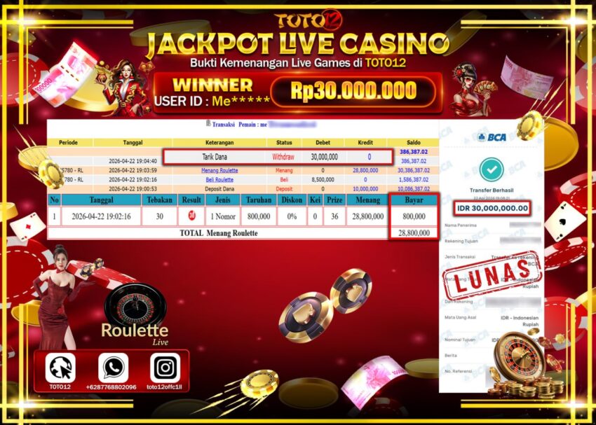 Selamat kepada Member Kami Me***** Telah Jackpot dan berhasil mendapatkan kemenangan besar pada permainan JACKPOT LIVE GAMES CASINO (ROULETTE) Dengan Kemenangan Sebesar Rp.30.000.000–.