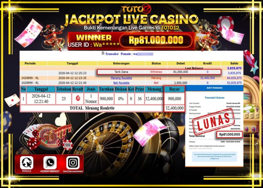 • HANYA DI TOTO12 JP PASTI DI BAYAR LUNAS DAN CEPAT!!!!!! JACKPOT LIVE GAMES CASINO (ROULETTE) Rp.81.000.000!!!!
