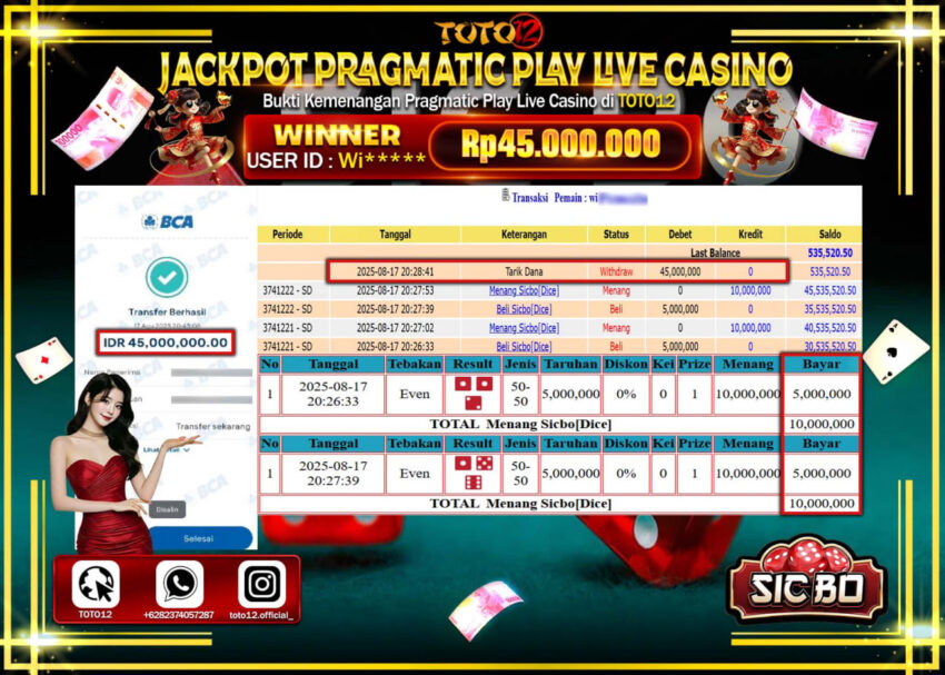 Selamat kepada Member Kami Wi****** Telah Jackpot dan berhasil mendapatkan kemenangan besar pada permainan JACKPOT LIVE CASINO (SIC BO) Dengan Kemenangan Sebesar Rp.45.000.000 –. Setelah mengisi Fomulir Withdraw dengan Kurang waktu 1-2 Menit Dana sudah kami Trasnfer kepada Pemilik Userid dan dana sudah dapat di cairkan oleh pemenang. Bukti Pembayaran yang TOTO12 berikan merupakan Bukti Pembayaran yang SAH / VALID yang langsung Di dapatkan melalui transaksi dari Bank yang di Tunju.
