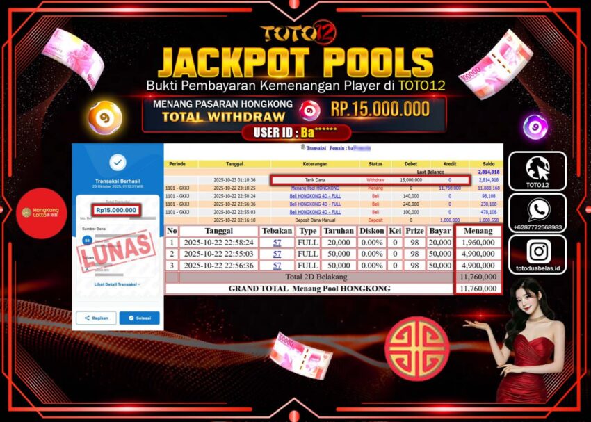 Selamat kepada Member Kami Ba****** Telah Jackpot dan berhasil mendapatkan kemenangan besar pada permainan JACKPOT POOLS PASARAN (HONGKONG)  Dengan Kemenangan Sebesar Rp.15.000.000 –.  Setelah mengisi Fomulir Withdraw dengan Kurang waktu 1-2 Menit Dana sudah kami Trasnfer kepada Pemilik Userid dan dana sudah dapat di cairkan oleh pemenang. Bukti Pembayaran yang TOTO12 berikan merupakan Bukti Pembayaran yang  SAH / VALID yang langsung Di dapatkan melalui transaksi dari Bank yang di Tunju.
