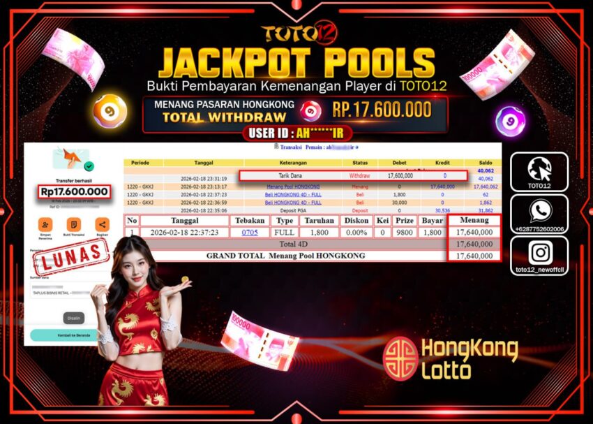 Selamat kepada Member Kami Ah*****ir Telah Jackpot dan berhasil mendapatkan kemenangan besar pada permainan JACKPOT POOLS PASARAN (HONGKONG) Dengan Kemenangan Sebesar Rp.17.600.000–.