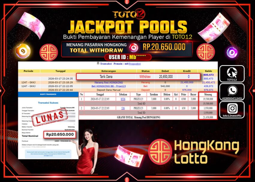 Selamat kepada Member Kami Mb*****  Telah Jackpot dan berhasil mendapatkan kemenangan besar pada permainan JACKPOT POOLS PASARAN  (HONGKONG)  Dengan Kemenangan Sebesar Rp.20.650.000–.