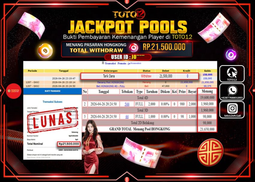 Selamat kepada Member Kami Jo****** Telah Jackpot dan berhasil mendapatkan kemenangan besar pada permainan JACKPOT POOLS PASARAN ( HONGKONG ) Dengan Kemenangan Sebesar Rp.21.500.000–.