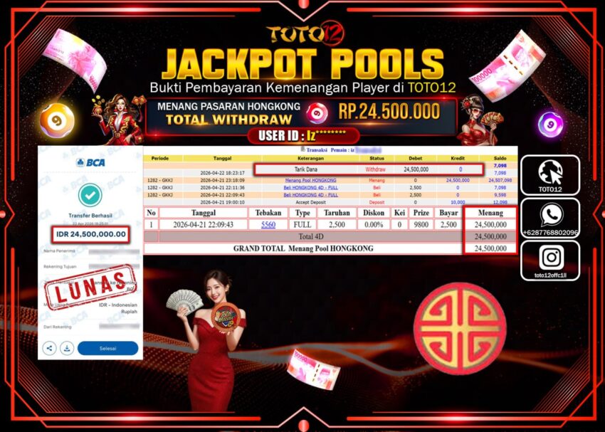 Selamat kepada Member Kami Iz****** Telah Jackpot dan berhasil mendapatkan kemenangan besar pada permainan JACKPOT POOLS PASARAN ( HONGKONG ) Dengan Kemenangan Sebesar Rp.24.500.000–.