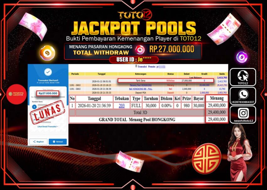 Selamat kepada Member Kami Je****** Telah Jackpot dan berhasil mendapatkan kemenangan besar pada permainan JACKPOT POOLS PASARAN (HONGKONG) Dengan Kemenangan Sebesar Rp.27.000.000 –.