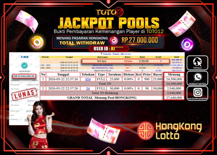 Selamat kepada Member Kami RI***** Telah Jackpot dan berhasil mendapatkan kemenangan besar pada permainan JACKPOT POOLS PASARAN (HONGKONG) Dengan Kemenangan Sebesar Rp.27.000.000–.