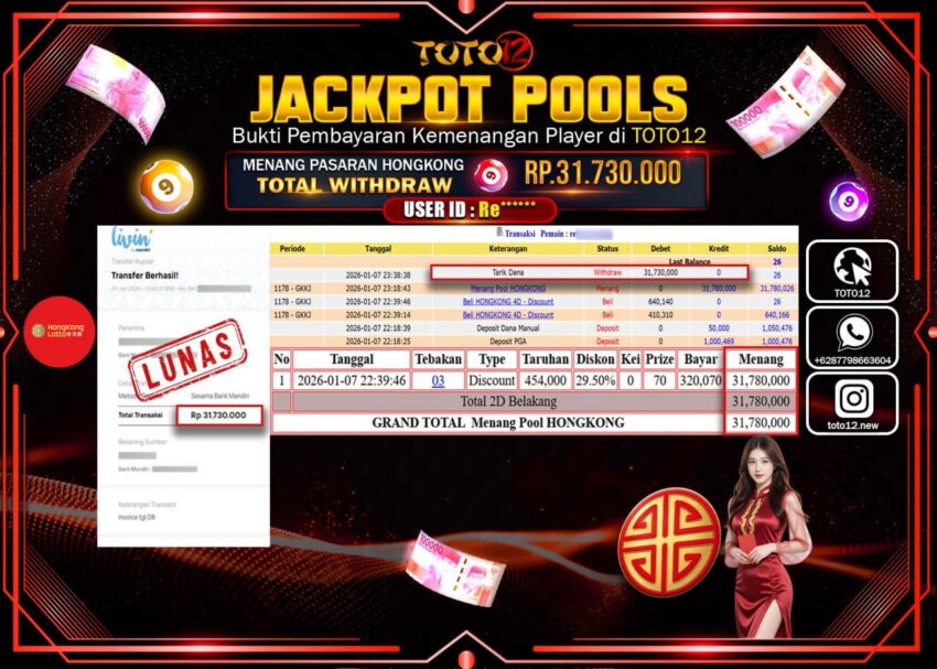 Selamat kepada Member Kami Re****** Telah Jackpot dan berhasil mendapatkan kemenangan besar pada permainan JACKPOT POOLS PASARAN (HONGKONG)  Dengan Kemenangan Sebesar Rp.31.730.000 –.