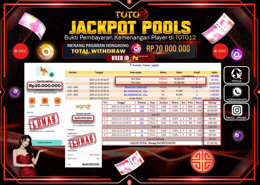 Selamat kepada Member Kami Pu****** Telah Jackpot dan berhasil mendapatkan kemenangan besar pada permainan JACKPOT POOLS PASARAN (HONGKONG) Dengan Kemenangan Sebesar Rp.70.000.000 –.