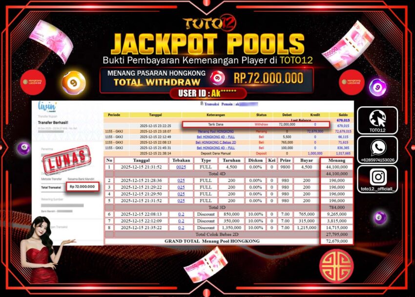 Selamat kepada Member Kami Ak****** Telah Jackpot dan berhasil mendapatkan kemenangan besar pada permainan JACKPOT POOLS PASARAN (HONGKONG) Dengan Kemenangan Sebesar Rp.72.000.000 –.