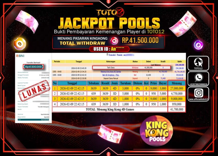 Selamat kepada Member Kami An***** Telah Jackpot dan berhasil mendapatkan kemenangan besar pada permainan JACKPOT POOLS PASARAN (King Kong 4D) Dengan Kemenangan Sebesar Rp.41.500.000–.