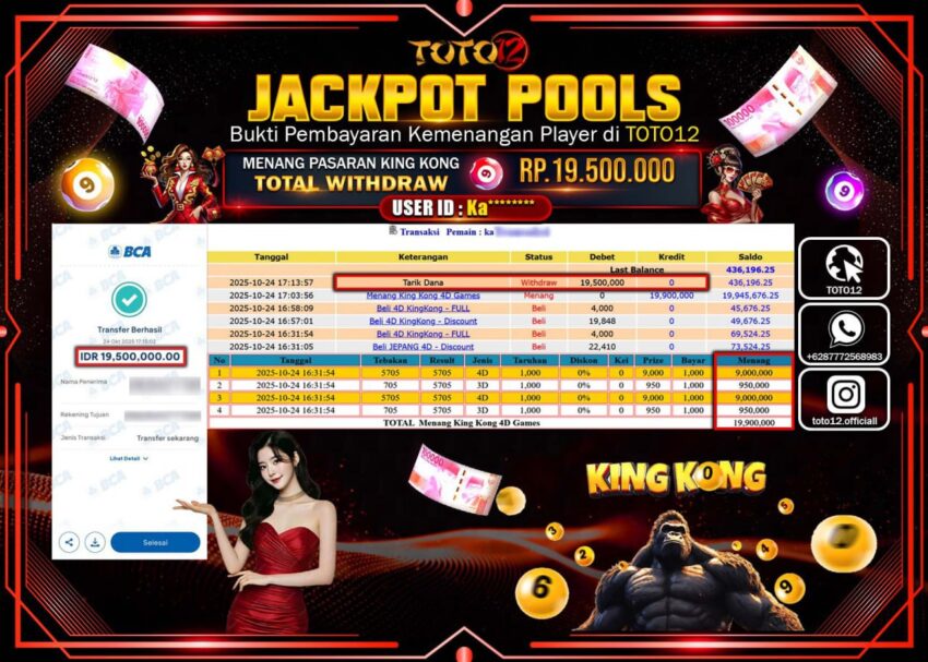 Selamat kepada Member Kami Ka****** Telah Jackpot dan berhasil mendapatkan kemenangan besar pada permainan JACKPOT POOLS PASARAN (KING KONG) Dengan Kemenangan Sebesar Rp.19.500.000 –. Setelah mengisi Fomulir Withdraw dengan Kurang waktu 1-2 Menit Dana sudah kami Trasnfer kepada Pemilik Userid dan dana sudah dapat di cairkan oleh pemenang. Bukti Pembayaran yang TOTO12 berikan merupakan Bukti Pembayaran yang SAH / VALID yang langsung Di dapatkan melalui transaksi dari Bank yang di Tunju.