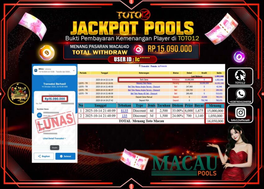 Selamat kepada Member Kami Lc****** Telah Jackpot dan berhasil mendapatkan kemenangan besar pada permainan JACKPOT POOLS PASARAN (MACAU 4D) Dengan Kemenangan Sebesar Rp.15.090.000 –. Setelah mengisi Fomulir Withdraw dengan Kurang waktu 1-2 Menit Dana sudah kami Trasnfer kepada Pemilik Userid dan dana sudah dapat di cairkan oleh pemenang. Bukti Pembayaran yang TOTO12 berikan merupakan Bukti Pembayaran yang SAH / VALID yang langsung Di dapatkan melalui transaksi dari Bank yang di Tunju.