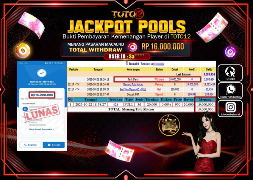 Selamat kepada Member Kami Sa****** Telah Jackpot dan berhasil mendapatkan kemenangan besar pada permainan JACKPOT POOLS PASARAN (MACAU 4D)  Dengan Kemenangan Sebesar Rp.16.000.000 –.  Setelah mengisi Fomulir Withdraw dengan Kurang waktu 1-2 Menit Dana sudah kami Trasnfer kepada Pemilik Userid dan dana sudah dapat di cairkan oleh pemenang. Bukti Pembayaran yang TOTO12 berikan merupakan Bukti Pembayaran yang  SAH / VALID yang langsung Di dapatkan melalui transaksi dari Bank yang di Tunju.