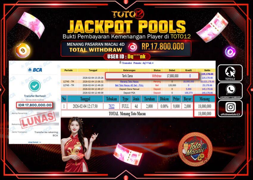 Selamat kepada Member Kami Dq****** Telah Jackpot dan berhasil mendapatkan kemenangan besar pada permainan JACKPOT POOLS PASARAN (MACAU 4D) Dengan Kemenangan Sebesar Rp.17.800.000 –.