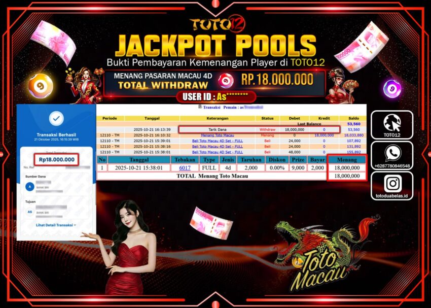 Selamat kepada Member Kami As****** Telah Jackpot dan berhasil mendapatkan kemenangan besar pada permainan JACKPOT POOLS PASARAN (MACAU 4D) Dengan Kemenangan Sebesar Rp.18.000.000 –. Setelah mengisi Fomulir Withdraw dengan Kurang waktu 1-2 Menit Dana sudah kami Trasnfer kepada Pemilik Userid dan dana sudah dapat di cairkan oleh pemenang. Bukti Pembayaran yang TOTO12 berikan merupakan Bukti Pembayaran yang SAH / VALID yang langsung Di dapatkan melalui transaksi dari Bank yang di Tunju.