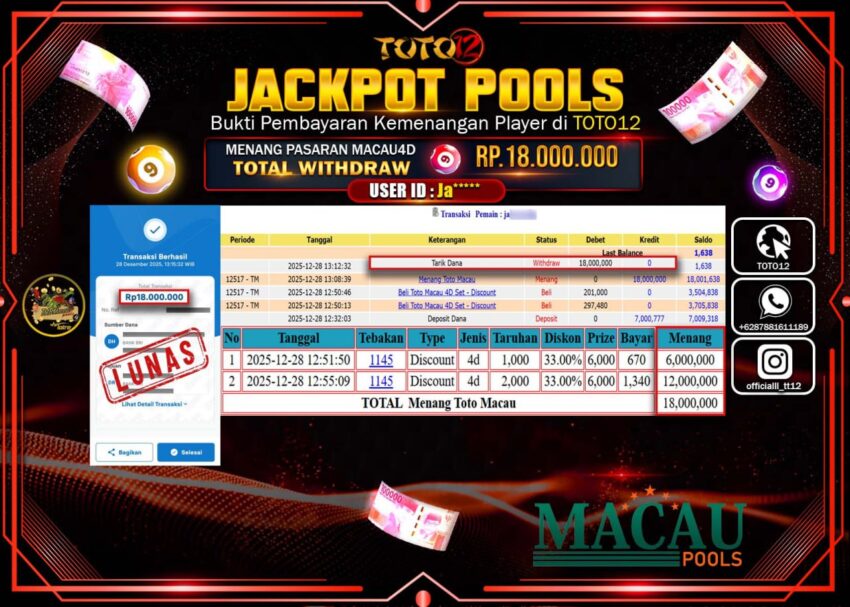 HANYA DI TOTO12 JP PASTI DI BAYAR LUNAS DAN CEPAT!!!!!! JACKPOT POOLS PASARAN (MACAU 4D) Rp.18.000.000 !!!!
