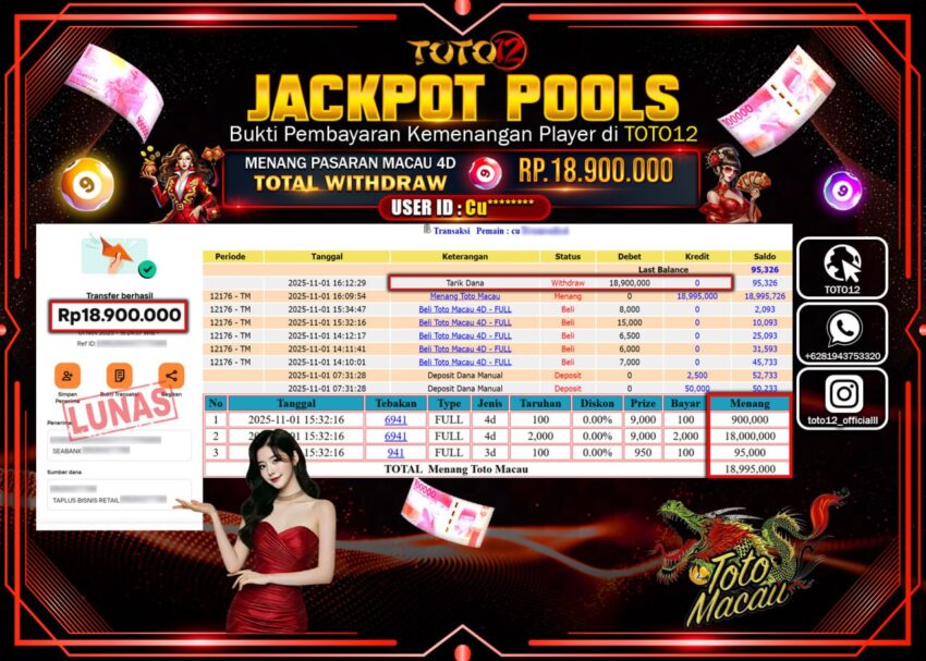 Selamat kepada Member Kami Cu****** Telah Jackpot dan berhasil mendapatkan kemenangan besar pada permainan JACKPOT POOLS PASARAN (MACAU 4D) Dengan Kemenangan Sebesar Rp.18.900.000 –. Setelah mengisi Fomulir Withdraw dengan Kurang waktu 1-2 Menit Dana sudah kami Trasnfer kepada Pemilik Userid dan dana sudah dapat di cairkan oleh pemenang. Bukti Pembayaran yang TOTO12 berikan merupakan Bukti Pembayaran yang SAH / VALID yang langsung Di dapatkan melalui transaksi dari Bank yang di Tunju.
