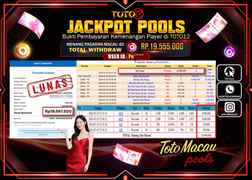 HANYA DI TOTO12 JP PASTI DI BAYAR LUNAS DAN CEPAT!!!!!! JACKPOT POOLS PASARAN (MACAU 4D) Rp.19.555.000!!!!