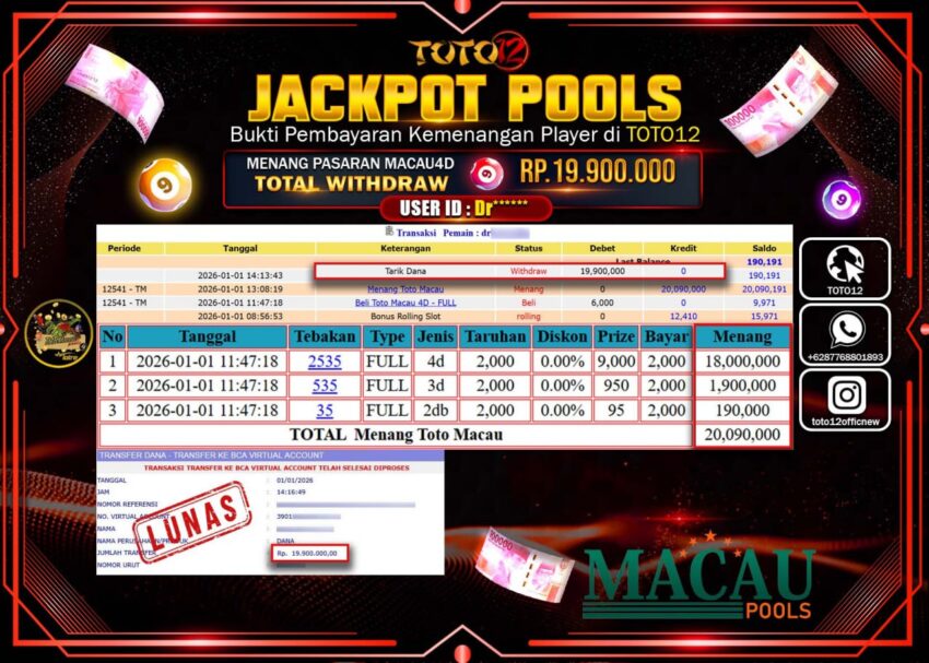 HANYA DI TOTO12 JP PASTI DI BAYAR LUNAS DAN CEPAT!!!!!! JACKPOT POOLS PASARAN (MACAU 4D) Rp.19.900.000 !!!!