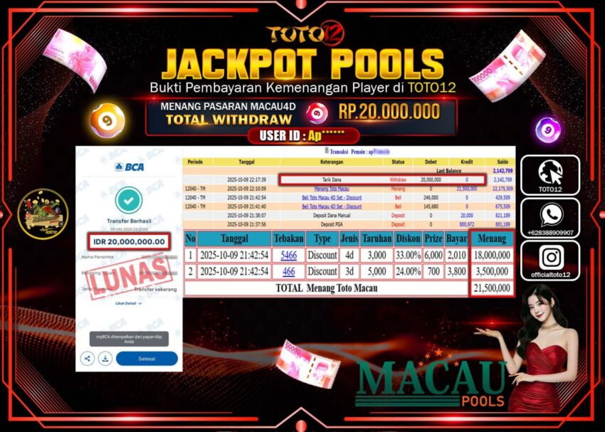 Selamat kepada Member Kami Ap****** Telah Jackpot dan berhasil mendapatkan kemenangan besar pada permainan JACKPOT POOLS PASARAN (MACAU 4D) Dengan Kemenangan Sebesar Rp.20.000.000 –. Setelah mengisi Fomulir Withdraw dengan Kurang waktu 1-2 Menit Dana sudah kami Trasnfer kepada Pemilik Userid dan dana sudah dapat di cairkan oleh pemenang. Bukti Pembayaran yang TOTO12 berikan merupakan Bukti Pembayaran yang SAH / VALID yang langsung Di dapatkan melalui transaksi dari Bank yang di Tunju.