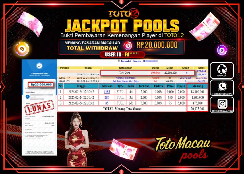 Selamat kepada Member Kami Fd****** Telah Jackpot dan berhasil mendapatkan kemenangan besar pada permainan JACKPOT POOLS PASARAN  (MACAU 4D)  Dengan Kemenangan Sebesar Rp.20.000.000–.