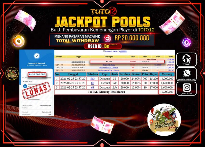 HANYA DI TOTO12 JP PASTI DI BAYAR LUNAS DAN CEPAT!!!!!! JACKPOT POOLS PASARAN (MACAU 4D) Rp.20.000.000!!!!