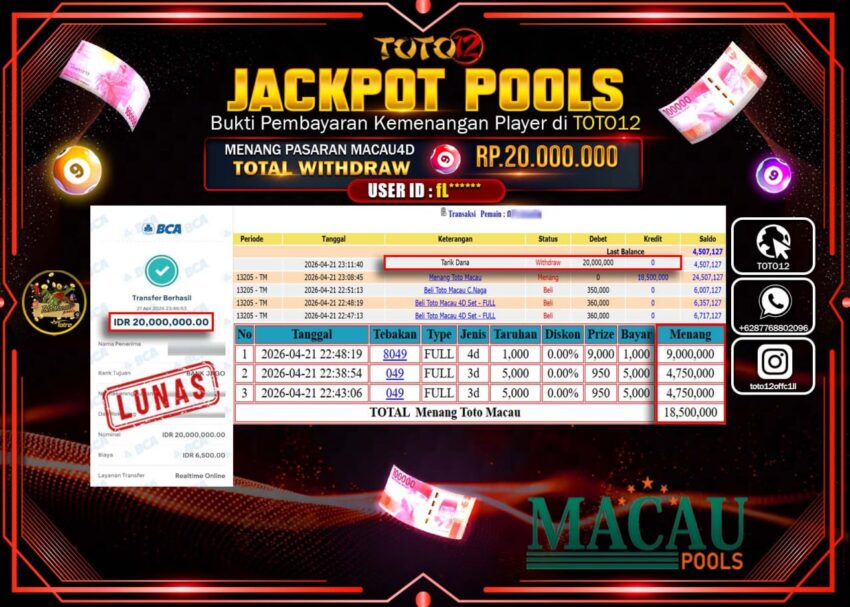 Selamat kepada Member Kami fL****** Telah Jackpot dan berhasil mendapatkan kemenangan besar pada permainan JACKPOT POOLS PASARAN (MACAU 4D) Dengan Kemenangan Sebesar Rp.20.000.000–.