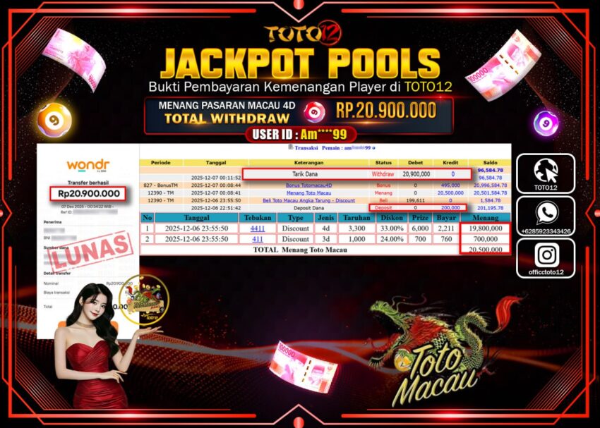 Selamat kepada Member Kami Am****** Telah Jackpot dan berhasil mendapatkan kemenangan besar pada permainan JACKPOT POOLS PASARAN (MACAU 4D) Dengan Kemenangan Sebesar Rp.20.900.000 –.