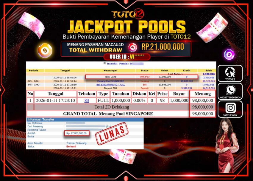 Selamat kepada Member Kami Vi****** Telah Jackpot dan berhasil mendapatkan kemenangan besar pada permainan JACKPOT POOLS PASARAN (MACAU 4D) Dengan Kemenangan Sebesar Rp.21.000.000 –.