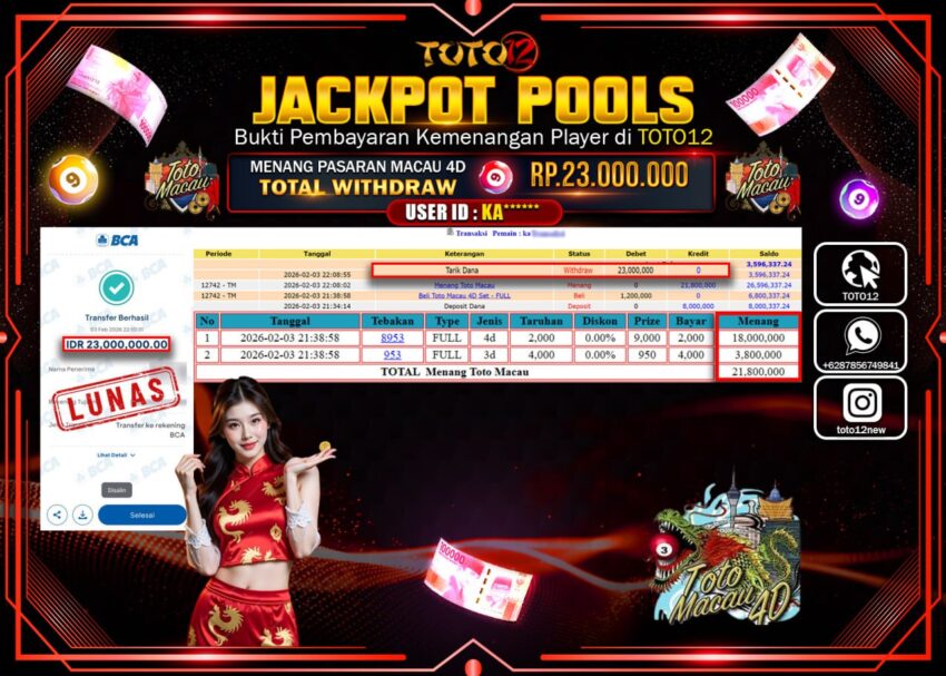 Selamat kepada Member Kami Ka****** Telah Jackpot dan berhasil mendapatkan kemenangan besar pada permainan JACKPOT POOLS PASARAN (MACAU 4D) Dengan Kemenangan Sebesar Rp.23.000.000–.