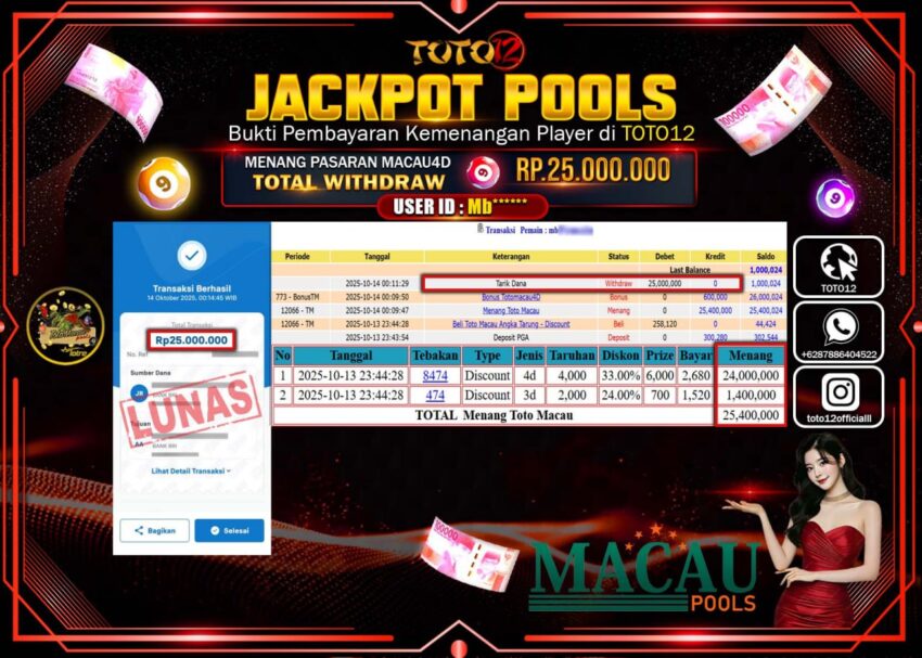 Selamat kepada Member Kami Mb****** Telah Jackpot dan berhasil mendapatkan kemenangan besar pada permainan JACKPOT POOLS PASARAN (MACAU 4D) Dengan Kemenangan Sebesar Rp.25.000.000 –. Setelah mengisi Fomulir Withdraw dengan Kurang waktu 1-2 Menit Dana sudah kami Trasnfer kepada Pemilik Userid dan dana sudah dapat di cairkan oleh pemenang. Bukti Pembayaran yang TOTO12 berikan merupakan Bukti Pembayaran yang SAH / VALID yang langsung Di dapatkan melalui transaksi dari Bank yang di Tunju.