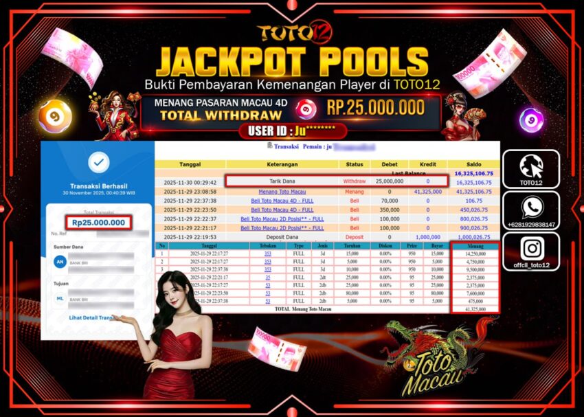 Selamat kepada Member Kami Ju****** Telah Jackpot dan berhasil mendapatkan kemenangan besar pada permainan JACKPOT POOLS PASARAN (MACAU 4D) Dengan Kemenangan Sebesar Rp.25.000.000 –.