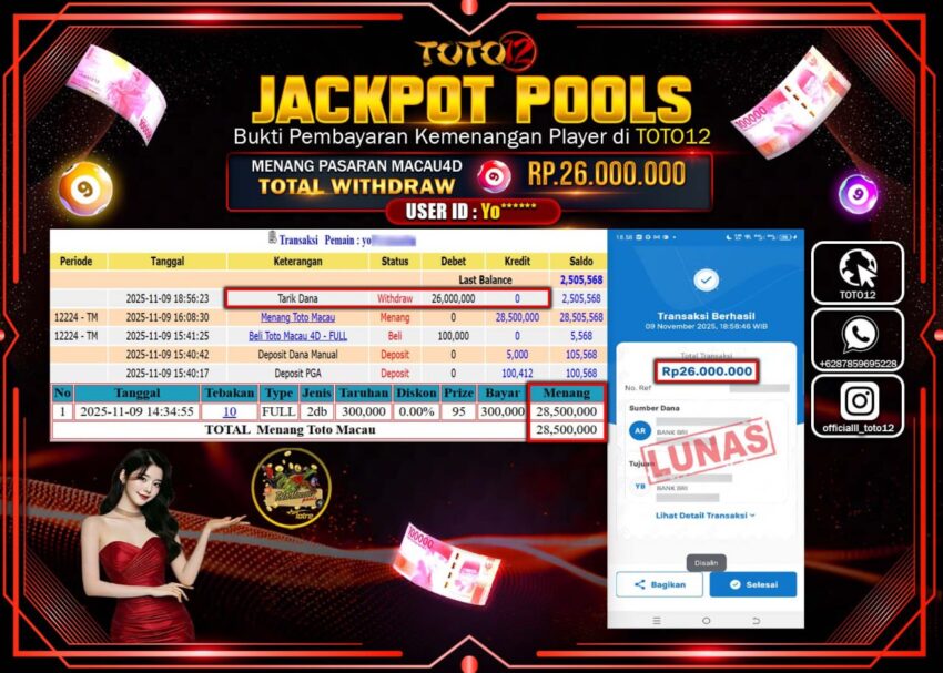 Selamat kepada Member Kami Yo****** Telah Jackpot dan berhasil mendapatkan kemenangan besar pada permainan JACKPOT POOLS PASARAN (MACAU 4D)  Dengan Kemenangan Sebesar Rp.26.000.000 –.  Setelah mengisi Fomulir Withdraw dengan Kurang waktu 1-2 Menit Dana sudah kami Trasnfer kepada Pemilik Userid dan dana sudah dapat di cairkan oleh pemenang. Bukti Pembayaran yang TOTO12 berikan merupakan Bukti Pembayaran yang  SAH / VALID yang langsung Di dapatkan melalui transaksi dari Bank yang di Tunju.