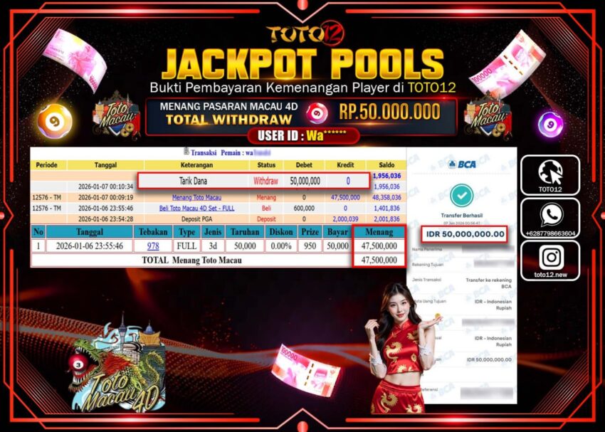 Selamat kepada Member Kami Wa****** Telah Jackpot dan berhasil mendapatkan kemenangan besar pada permainan JACKPOT POOLS PASARAN (MACAU 4D) Dengan Kemenangan Sebesar Rp.50.000.000 –.