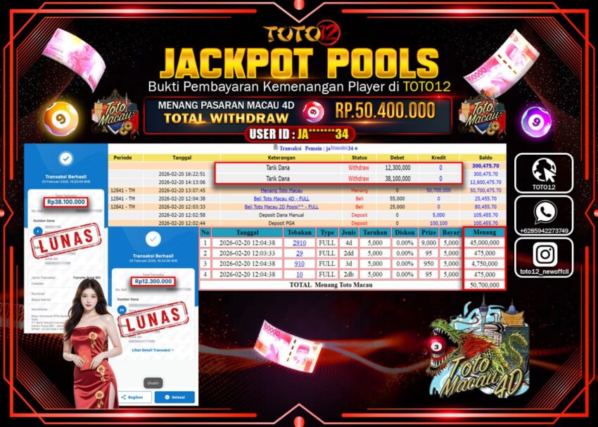 Selamat kepada Member Kami Ja******34 Telah Jackpot dan berhasil mendapatkan kemenangan besar pada permainan JACKPOT POOLS PASARAN (MACAU 4D) Dengan Kemenangan Sebesar Rp.50.400.000–.